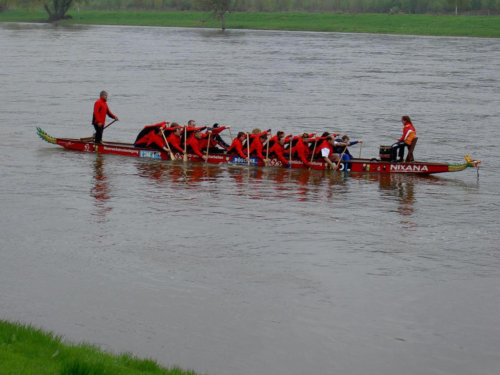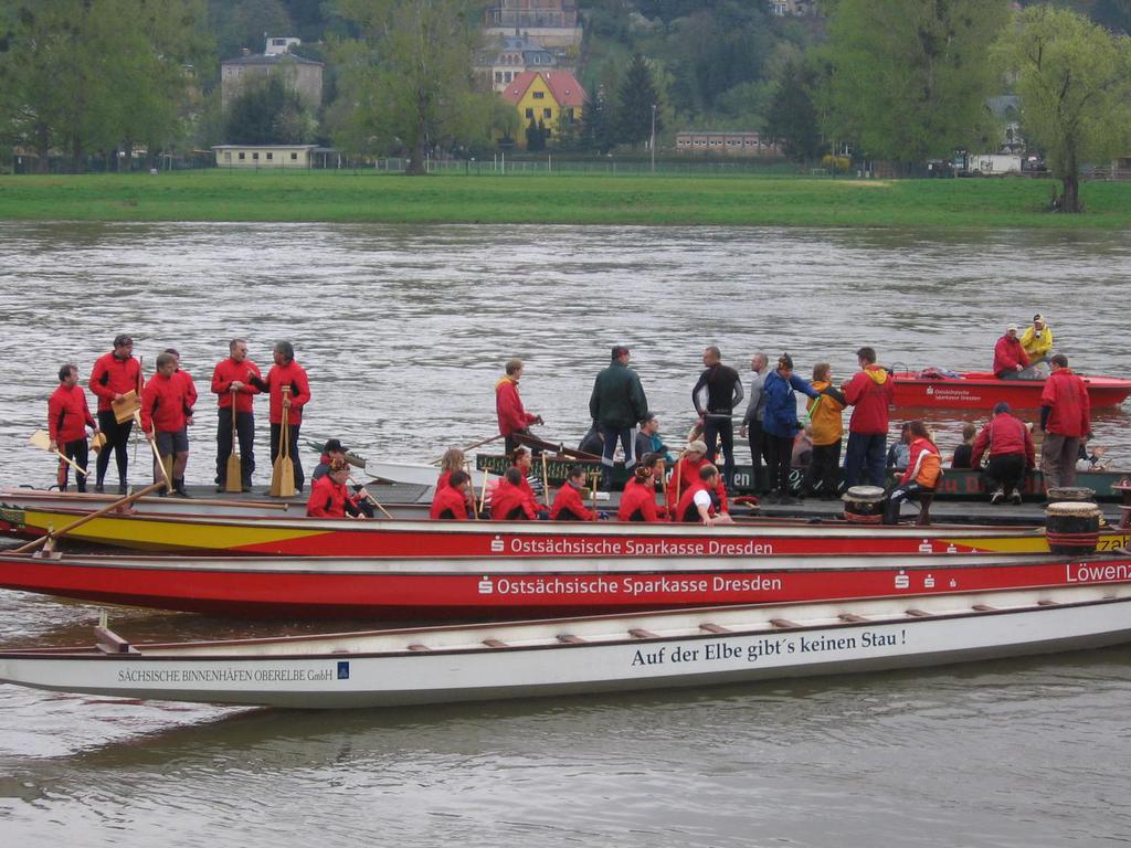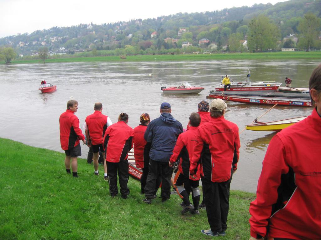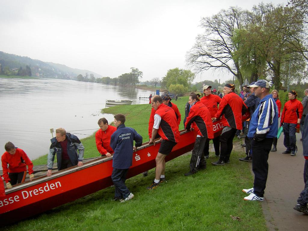 Vom 29.04. – 01.05.2006 nahmen wir teil am 1. Dresdner Schlössercup, auch die Dragolympic Games genannt. Diese Mischung aus Drachenboot-Rennen und anderen unterhaltsamen Disziplinen fand auf der Elbe und auf dem Vereinsgelände des Verein Kanusport Dresden e.V. statt. Insgesamt nahmen 7 Teams aus der ganzen Republik teil. Vom Frühling war am Samstag leider noch nichts zu spüren. Trotz der eisigen Kälte und noch leicht übermüdeten Teilnehmern (wir fuhren durch die Nacht) gingen wir die Langstrecke als 1. Disziplin mit dem nötigen Respekt an. Die Elbe führte zu diesem Zeitpunkt noch reichlich Hochwasser und deshalb wurde die Steckenlänge auf 8 km verkürzt. Hier konnten wir für unsere Verhältnisse sehr gut mitpaddeln. Durch ein geniales Wendemanöver unseres Steuermanns, konnten wir uns auf den vorletzten Platz vorkämpfen und konnten diesen bis zum Ziel auch erfolgreich verteidigen. Eine sehr gute Leistung für eine Mannschaft, die eine solche Distanz noch nie im Wettkampf gefahren war.