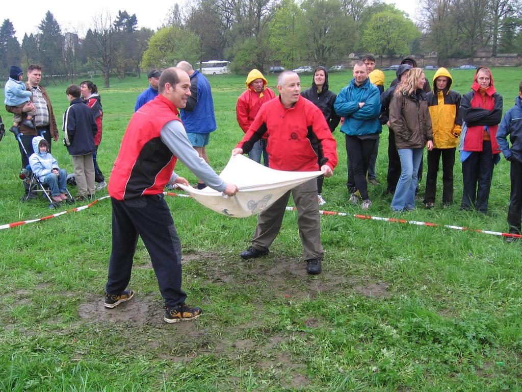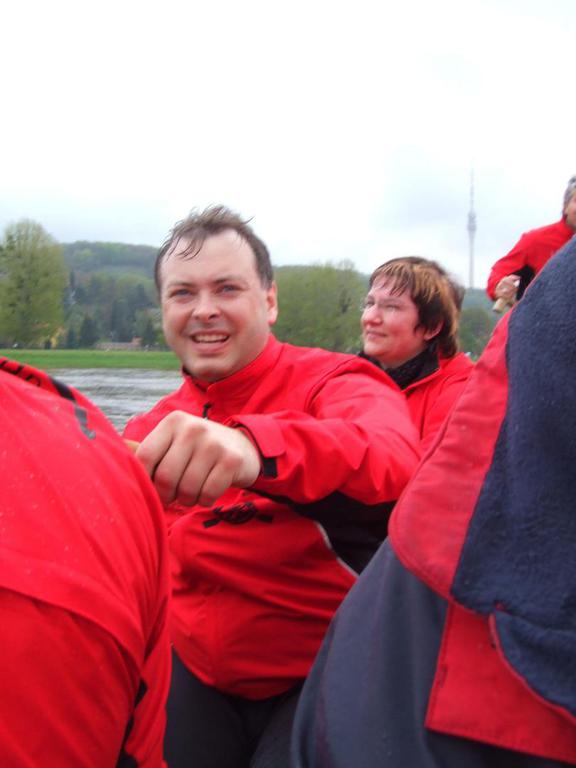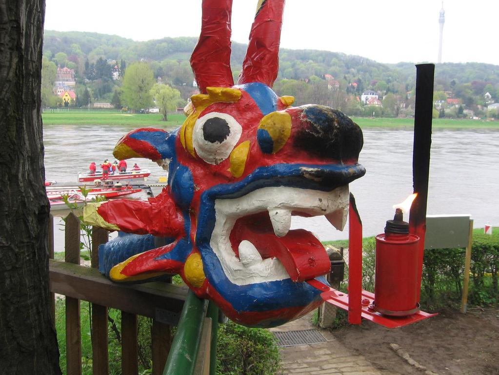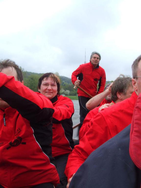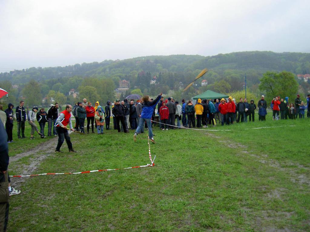Vom 29.04. – 01.05.2006 nahmen wir teil am 1. Dresdner Schlössercup, auch die Dragolympic Games genannt. Diese Mischung aus Drachenboot-Rennen und anderen unterhaltsamen Disziplinen fand auf der Elbe und auf dem Vereinsgelände des Verein Kanusport Dresden e.V. statt. Insgesamt nahmen 7 Teams aus der ganzen Republik teil. Vom Frühling war am Samstag leider noch nichts zu spüren. Trotz der eisigen Kälte und noch leicht übermüdeten Teilnehmern (wir fuhren durch die Nacht) gingen wir die Langstrecke als 1. Disziplin mit dem nötigen Respekt an. Die Elbe führte zu diesem Zeitpunkt noch reichlich Hochwasser und deshalb wurde die Steckenlänge auf 8 km verkürzt. Hier konnten wir für unsere Verhältnisse sehr gut mitpaddeln. Durch ein geniales Wendemanöver unseres Steuermanns, konnten wir uns auf den vorletzten Platz vorkämpfen und konnten diesen bis zum Ziel auch erfolgreich verteidigen. Eine sehr gute Leistung für eine Mannschaft, die eine solche Distanz noch nie im Wettkampf gefahren war.