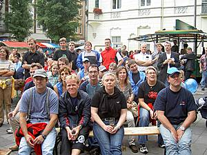 Danach wurde es noch einmal richtig spannend. Die dritte und letzte Disziplin war das Wissensquiz. Dieses wurde auf einer Bühne auf dem Beuler Rathausplatz durchgeführt. Es ging in 3 Runden mit jeweils 4 Fragen zum Thema Wasser und Naturschutz. Unser Wissensteam wurde gestellt durch Michael "Mike" Herzog, Charles Rhoades, Johannes Müller und unserem Präsidenten Klaus Weber. Leider verlief der Start nicht ganz so glücklich, stellten sich doch die Fragen am Anfang als ziemlich knifflig heraus. Und so konnte das Team erst ab der 3. Frage punkten. Die Gesichter wurden immer nachdenklicher und auch unseren Präsidenten sah man noch nie so ratlos. Wurde jetzt alles noch mal umgedreht und ein möglicher Sieg verschenkt? Doch in den nächsten Runden konnten weitere Punkte eingefahren werden und auch diese Disziplin auf einem 4. Platz beendet werden.