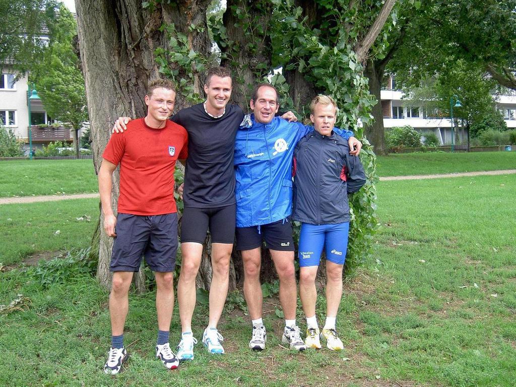 Das Wetter sah zu diesem Zeitpunkt nicht gut aus und es regnete in Strömen. Pünktlich jedoch zum Achtelmarathon hörte der Regen kurz vorher auf und so konnten wir unser Läuferteam, bestehend aus Jörg Schneider, Andreas Barth, Stefan Baumann und Michael Bendigs anfeuern. Hier zeigte sich die Klasse unserer Läufer. Der erste von allen Läufern der das Ziel erreichte war Andreas. Kurz darauf war auch Stefan im Ziel angekommen. Doch gewertet wurde erst, wenn der letzte Läufer des Teams die Ziellinie überschreitet. Jörg lief trotz seiner persönlichen Möglichkeiten als Letzter in der Gruppe, und schob so Michael mit nach vorne und trieb ihn kontrolliert bis an seine konditionellen Grenzen. Dadurch lief das Team ein hervorragend taktisches Rennen und wurde 2. dieses Laufs. Eine respektable Leistung aller Läufer. Mit diesem Ergebnis waren wir sehr gut in diesen Wettkampf gestartet.