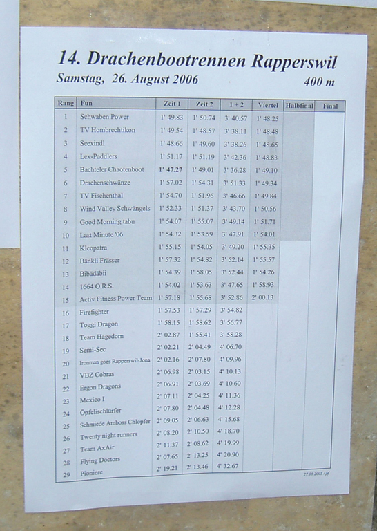 Am 26.August 2006 brachen wir zum Drachenbootrennen nach Rapperswil-Jona an den Züricher See auf. Die Wetterprognosen verhießen nichts Gutes. Doch wir hatten Glück: In Rapperswill angelangt war es sonnig und dabei nicht zu warm – bestes Drachenbootwetter also.