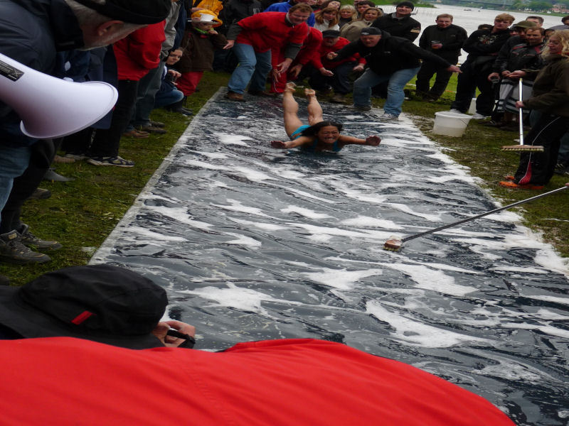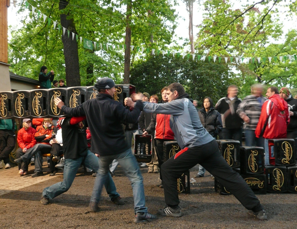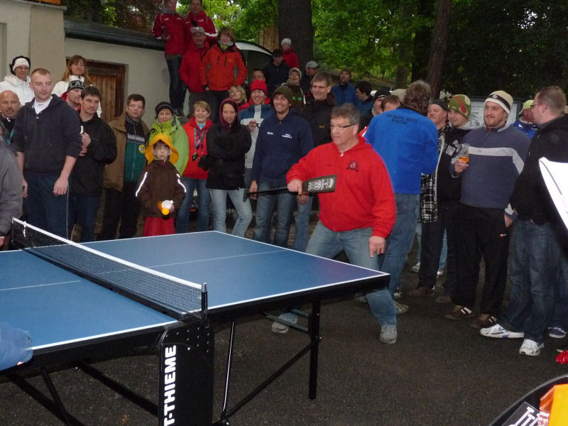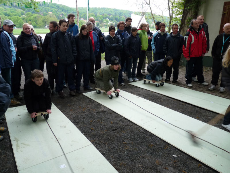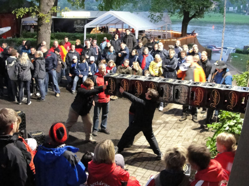 Beim Drachencurling mussten wir den seit letztem Jahr anhaltenden Trend Rechnung tragen. Hier genügt es nicht mehr, nur eine Person auf einer mit Seifenwasser getränkten Plastikbahn möglichst nahe an ein Kreuz heran zu schieben. Es muss dabei am Besten noch äußerst sexy aussehen. Deshalb entschied man sich diesmal anstatt dem König unsere Trommlerin Babs als Curl herzunehmen. Dies hatte zum einen den Vorteil, dass ein gewisser Gewichtsunterschied da war, und zum anderen unserer neuer "Curl" in ihrem neu gekauften Bikini noch extrem gut aussah. Gäbe es hier eine B-Note, die höchste wäre unserer Trommlerin zugesprochen worden! Leider warf man doch zu zaghaft und konnte mit 78cm zum Ziel nur einen 8. Platz erreichen. Trotzdem: Bei einer Lufttemperatur von 8°C und widrigem Wind im Bikini, während andere mit der Winterjacke dastehen, muss man unserer Babs Hochachtung aussprechen. Die letzten Spiele wurden dann nach einer kleinen Pause wieder auf dem Gelände des Vereins Kanusport Dresden durchgeführt. Hier gab es erstmals 2 neue Disziplinen. Beim Dragolympischen Surfen wird eine Person auf einem Gestell mit Möbelrollen über eine Strecke gezogen. An dem Gestell ist ein Seil befestigt, welches wiederum auf einen Stock aufgewickelt werden muss. Dass der Mannschaft neue Spiele liegen, bewiesen sie ja immer wieder in den vorangegangenen Dragolympics. Endlich konnte man einen 1. Platz in einer Disziplin belegen und sich damit in der Gesamtwertung auf den vorderen Plätzen festsetzen. Dann kam die 2. neue Disziplin. Ping Pong mit kleinen Stechpaddeln. Hier galt es in mehreren Runden im sog. Rundlauf-Modus sich bis ins Endspiel zu spielen. Daß allerdings Tisch-Tennis doch ein Sport für die eher jüngeren Generationen ist, war wohl ein Trugschluss. Hier muss wohl für das nächste Jahr mal geübt werden. Hier reichte es dann auch nur für den vorletzten Platz. Das letzte Spiel wie jedes Jahr war das berüchtigte Bierkastenstapeln. Eine Disziplin in der das Team SchwabenPower 2 Jahre in Folge den Dragolympischen Rekord hielt. Nach dem Debakel des letzten Jahres in der die Damenmannschaft mehr Kisten als die Herren gegen die Wand brachten, hatten wir große Hoffnungen dieses Mal wieder an die Spitze heranzukommen. Doch trotz einer Technikumstellung, konnten die Herren noch weniger Kästen als im letzten Jahr bewältigen und so mussten die Frauen wieder ins Stechen. Am Ende wurde ein 8. Platz daraus.