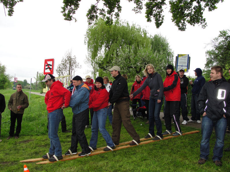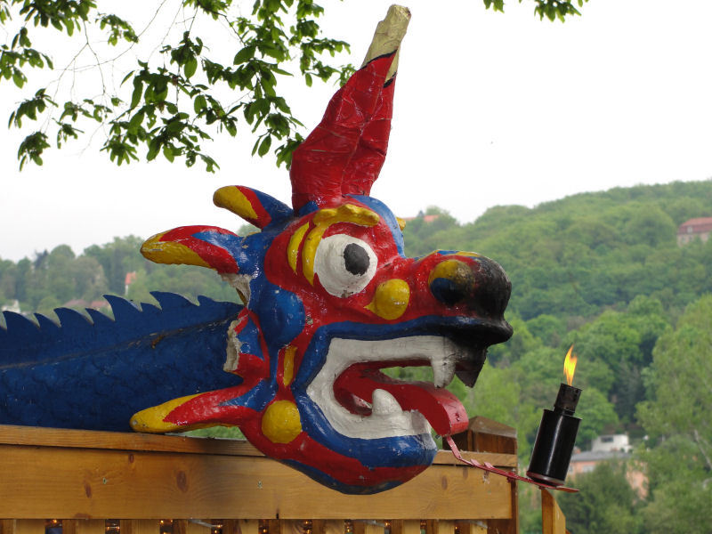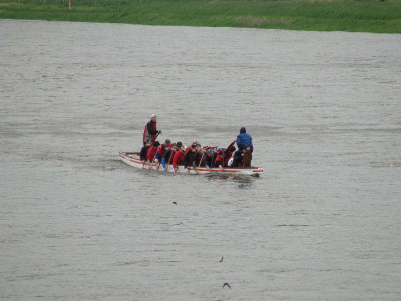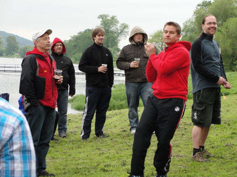 Nach einer Mittagspause wurden die Spiele dann fortgesetzt. Da es die Tage davor schon geregnet hatte und die eigentliche Wiese für die Spiele aufgeweicht war, wurden die restlichen Spiele kurzerhand auf das Elbufer verlegt. Da es aber hier recht abschüssig zum Wasser zugeht, hatte dies ein besonderen Reiz mit dem bereits bekannten Dragoski. Leider hatte das neu zusammengestellte Ski-Team bei ihrem 1. Versuch Schwierigkeiten den Berg wieder hinauf zukommen. Doch bei den weiteren Läufen klappte alles reibungslos und so wurde hier ein 5. Platz erreicht. Bei anderen Disziplinen wie der des Dracheneierlei war man im Mittelfeld und belegte den 6. Platz. Beim Paddelweitwurf holte man mit einer Gesamtweite von 31,20m den 3. Platz. Verstärkt wurden wir hier durch Martin, unseren 1. Fan von Team SchwabenPower, der unseren Michl auf dieser Position hervorragend vertrat.