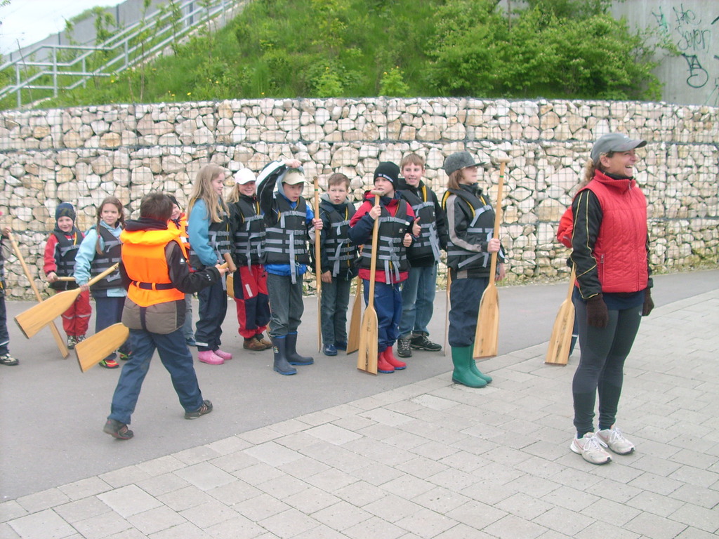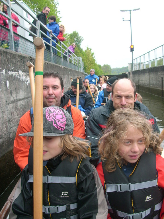 Ein ganz besonderes Erlebnis hatten wir den Kindern der Grundschule Wippingen und deren Eltern mit einer Drachenbootfahrt versprochen – und dieses Versprechen haben wir, wenn auch eher unfreiwillig und ungeplant, voll eingehalten. Nach einer gemütlichen Flussabwärtstour klappte die Einfahrt des Drachenboots in die Schleuse problemlos, das Tor schloss sich und mit dem Wasserspiegel sank das Boot auf das Niveau der Donau unterhalb des Kraftwerks Böfinger Halde. Aber nun öffnete sich das Schleusentor nicht sofort – Irgendwas klemmte. Ein paar bange Minuten folgten und alle Drachenbootler fragten sich : was mach´ mer jetz´, wer hot a Idee ?