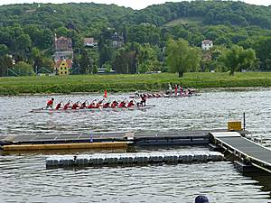 Nach einer sehr kurzen Verschnaufpause und einer klitzekleinen Bootsumbesetzung gings zum Start für die Königsdisziplin. Und dieser Start war wirklich wirklich genial. Das Boot war wach. Schon nach dem „Go“ holten wir uns einen Vorsprung von mehreren Bootslängen heraus. Vor uns das Blaue Wunder, hinter uns das Getrommel der restlichen Armada. Und es hätte so schön bleiben können…. Wäre da nicht die Wende gekommen. Die Hallenser überschätzten wohl unsere Geschwindigkeit an der Wende und rammten unser Heck, daraufhin wurden wir einige Meter Richtung Radebeul getrieben. Wir mussten erstmal wieder ausparken, realisieren was passiert war und sahen nun vor uns alle anderen Boote davon fahren. Nach einem lauten Schrei von Charles „das Rennen ist noch nicht vorbei“ und den „Auf geht’s"-Rufen von Babs reichte unser Adrenalin aus, um sehr bald schon wieder aufzuschließen.