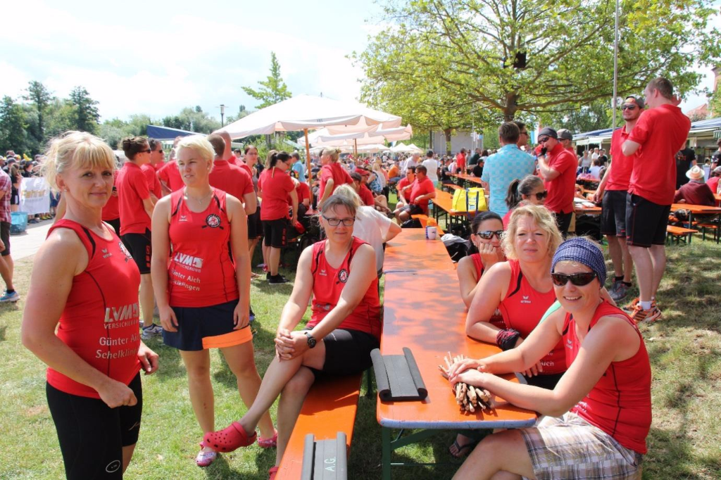 Das vollbesetzte Auto aus Langenau hatte einen Zeitvorsprung um das Teamcaptainsmeeting nicht zu verpassen und das beste Plätzchen auf dem Promenadenweinfest zu reservieren. Unsere Platzwahl, in vorderster Reihe unter einem tollen Baum auf einem Hügelchen, traf im Großen und Ganzen auf Zustimmung, nur unser ortskundiger Trainer (er kommt aus Dettelbach) meinte es gäbe auch noch eine bessere Stelle zum Zuschauen. Wir werden es uns für nächstes Jahr merken ;-)