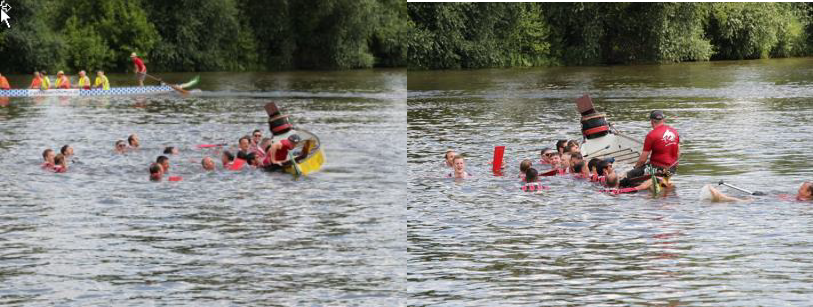 Um unsere Neugierde zu stillen und eventuell Schiffbrüchige aufzunehmen, ließ uns unser Trainer vor dem Finallauf zum Ort des Geschehens paddeln. Nachdem wir sahen, dass alle freudig feiernd an