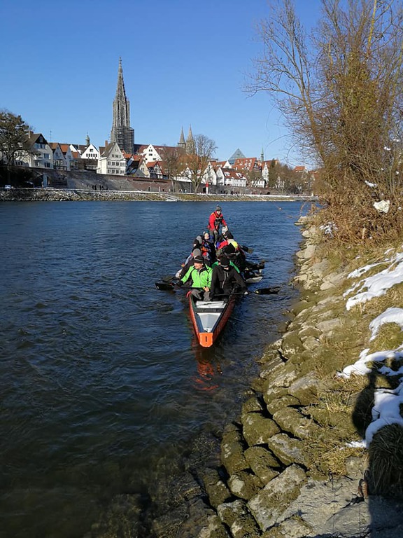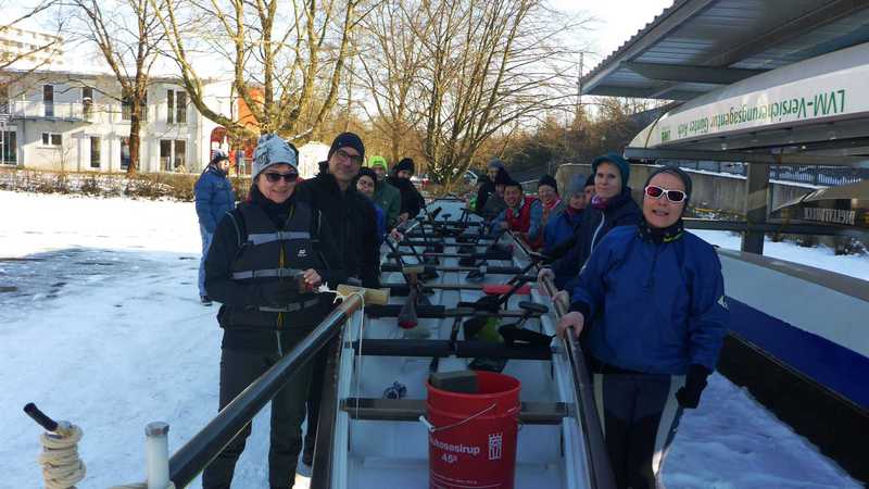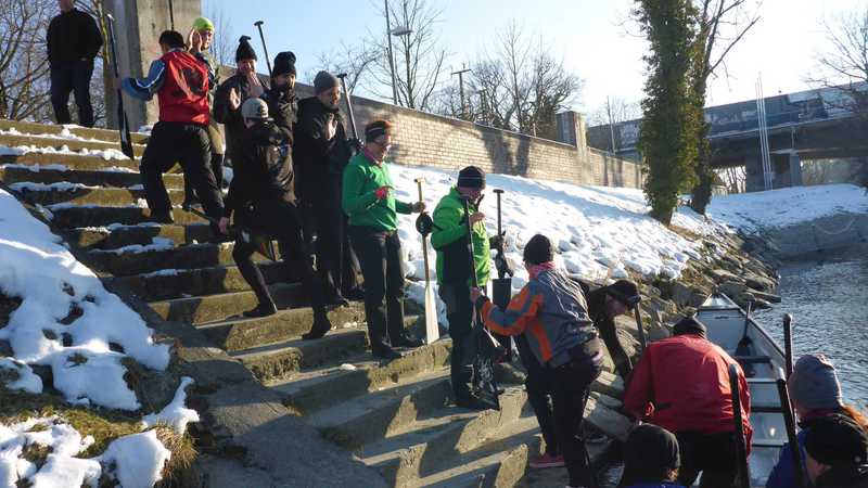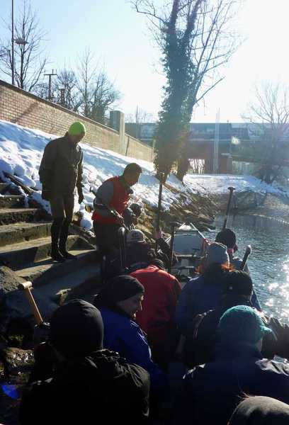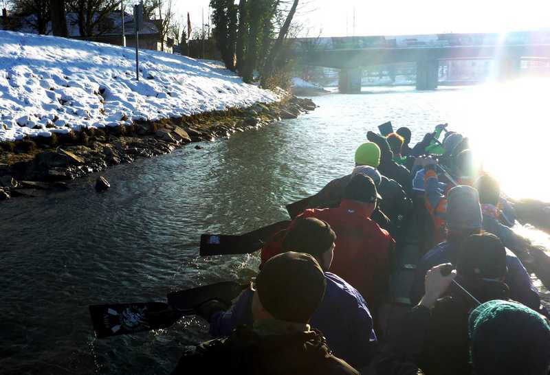 -2° und Schnee, aber wunderbare Wintersonne und 18 Paddler/innen im Boot.