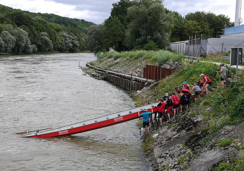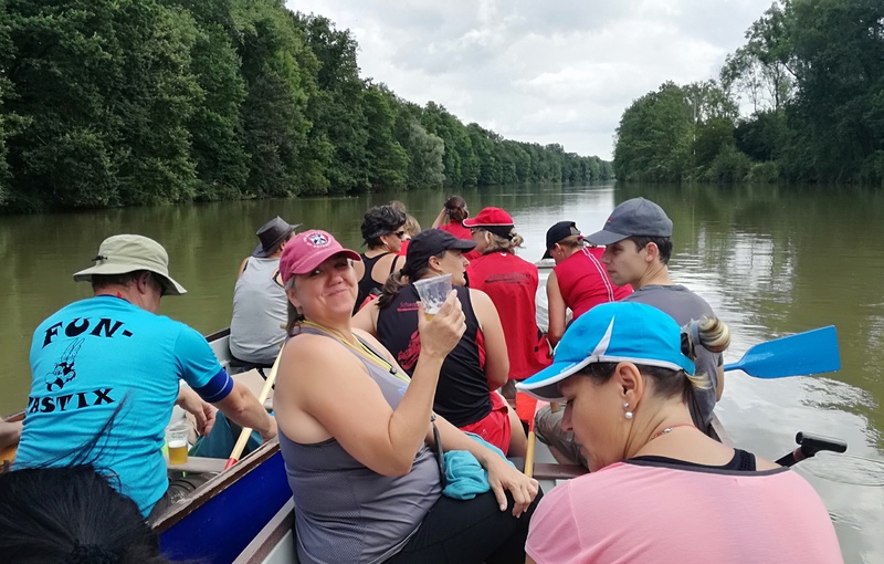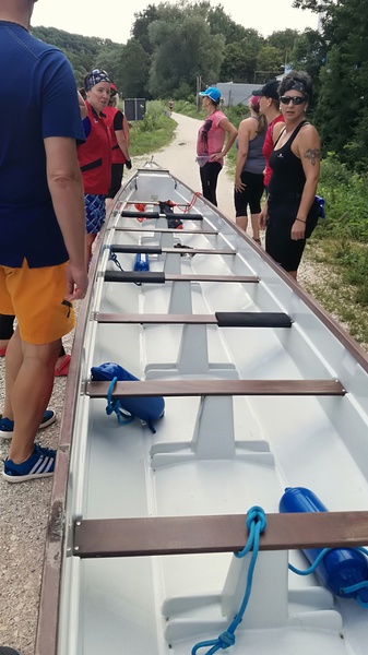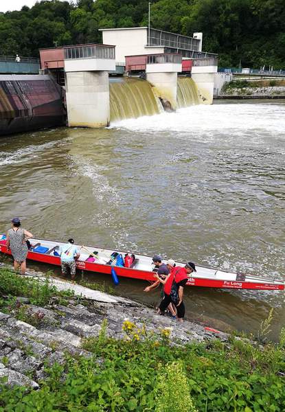 Eine gewisse Spannung war allen anzumerken, aber eine knappe Stunde später lagen beide Drachenboote unterhalb des Wehrs im Wasser und die Paddler genehmigten sich ein ausgiebiges Schleusenbier.